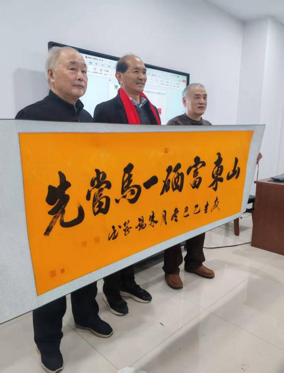 上图:中国书法家协会副会长朱锡学1月16日在会议现场挥毫为富硒大会献墨宝。边建朝主任(右)和刘延祥(左)接收并与朱锡学先生合影